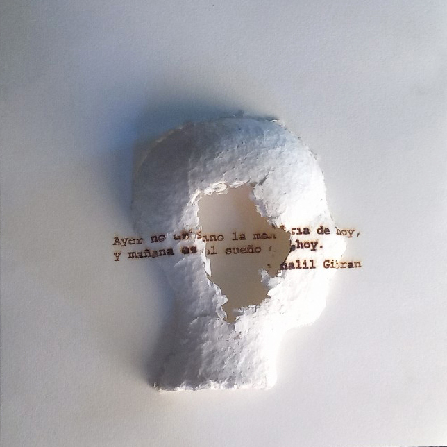 « Profil / Série dhommages aux écrivains, Texte de Gibran Khalil Gibran. » 50 cm x 50 cm Madrid, 2021. . Pâte cellulose de papier recyclé transférée à travers des moules en plâtre. Texte imprimé avec le laser. Papier fabriqué par lauteur.
