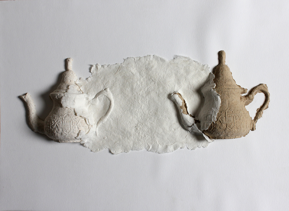 « Tea-App. / Series Memory weakness » 52,5 cm x 37,5 cm Madrid, 2020. . Pâte cellulose de papier recyclé transférée à travers des moules en plâtre. Stylisée et estampée en action directe. Papier fabriqué par lauteur.