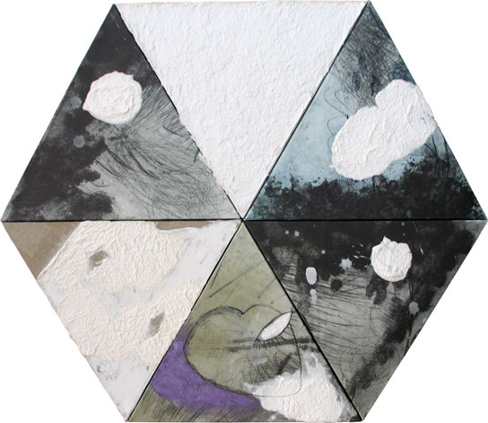Flexibilidad 4 / Serie: Puzzle » Obra gráfica, Bidimensional / 71 x 81 Cm. [6 Módulos, 40 x 40 x 40 x 5 Cm.] Agua fuerte, resinas, planchas de offset tratadas con sulfato de cobre, pasta de papel hecho a mano. Doble estampación sobre papel BFK Rives 300 gr. combinada con papel hecho a mano y tela de lino Madrid 2010 |