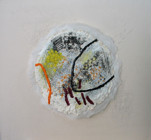 Técnica mixta, compuesta con papel hecho a mano, con molde circular y cónico, collage, estampación gráfica y acrílico.